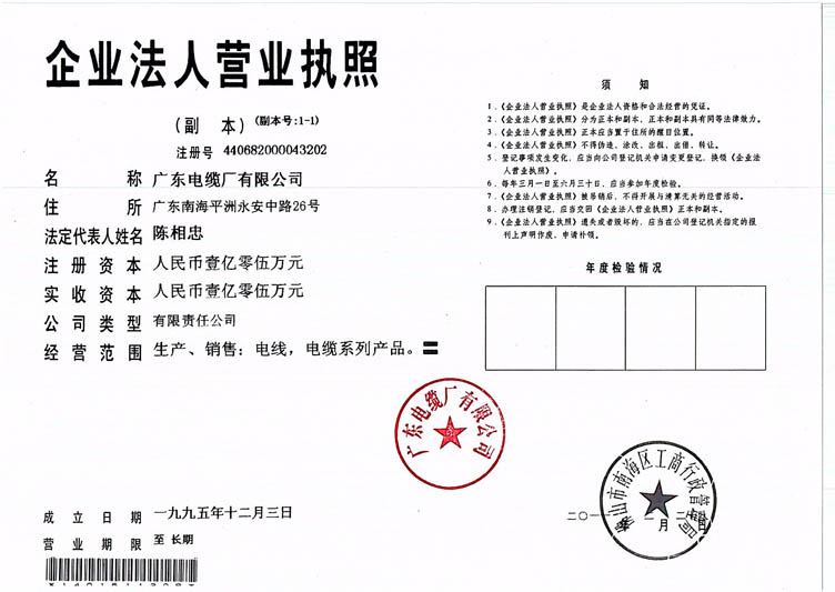 廣東電纜廠有限公司營(yíng)業(yè)執(zhí)照: